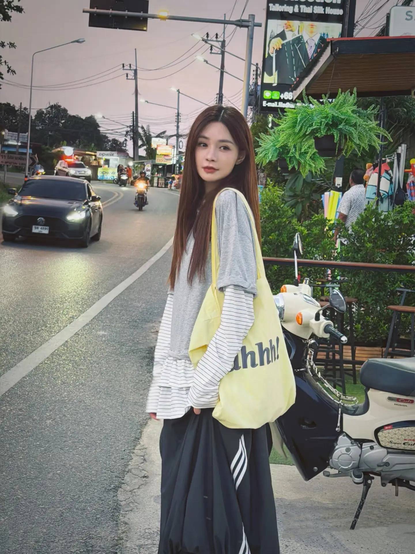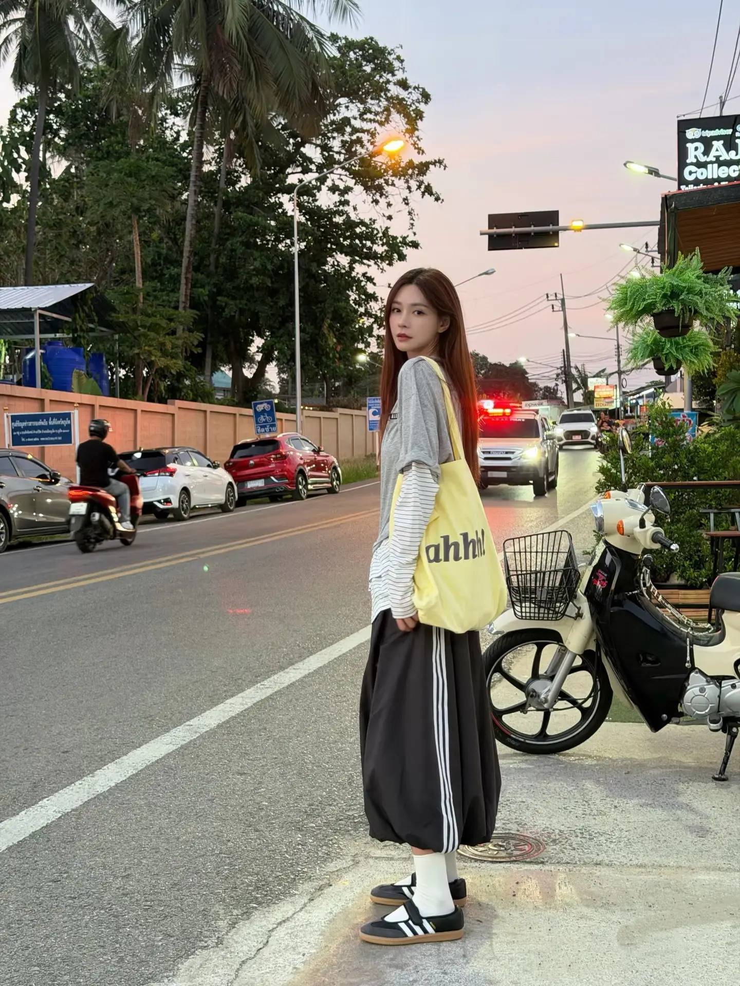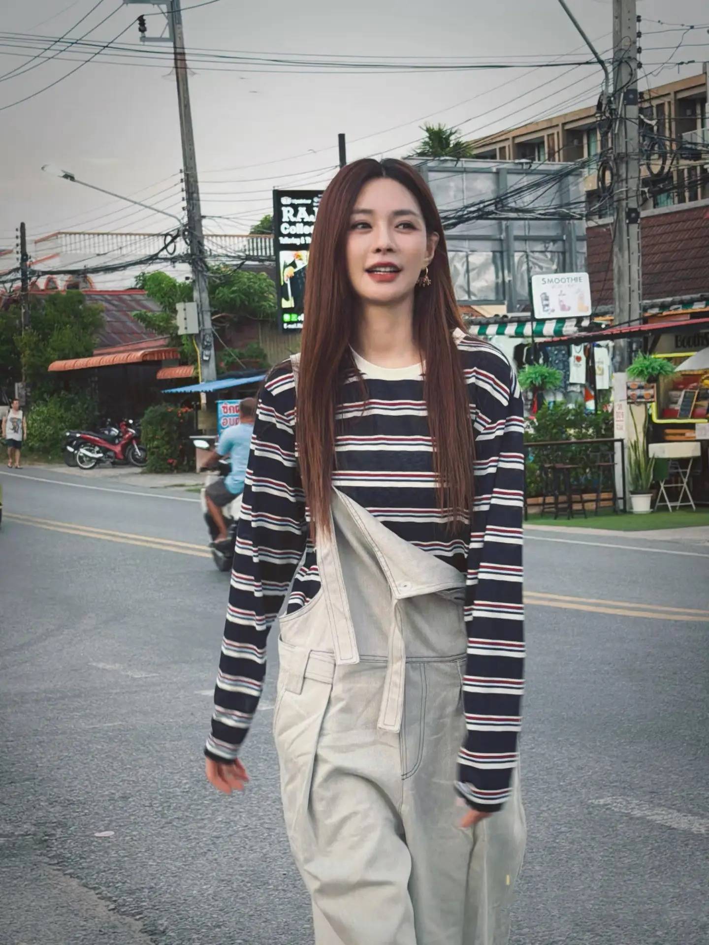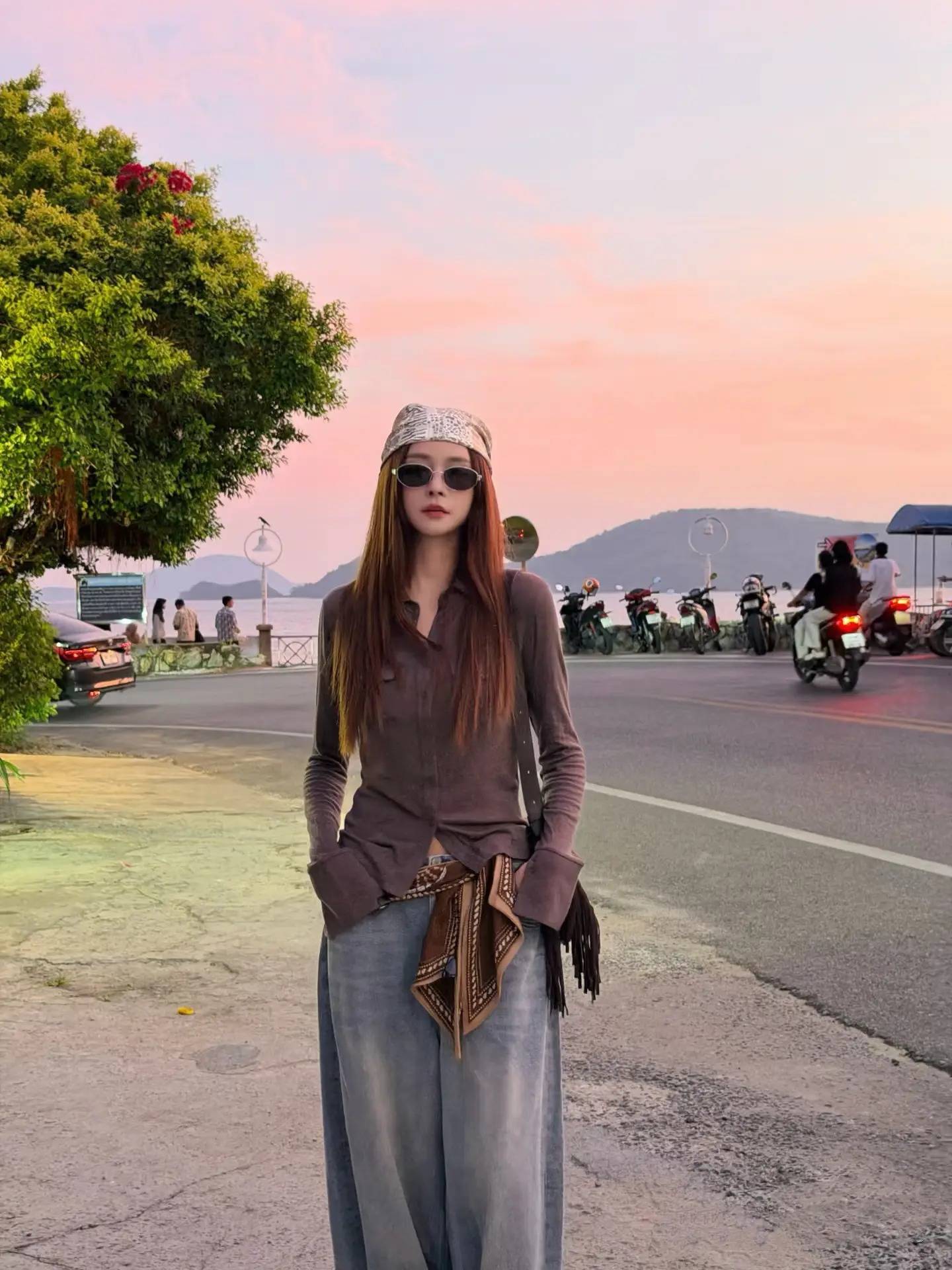 脚边是穿梭的摩托车与路边的绿植,整个人像从街头画报里走出来的旅人,松弛又鲜活。