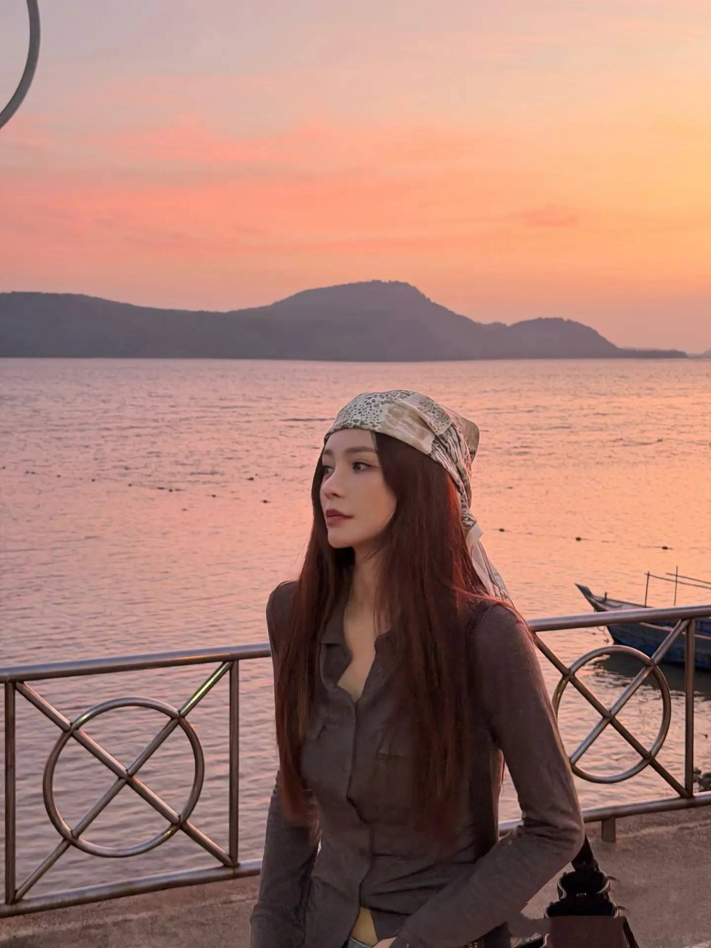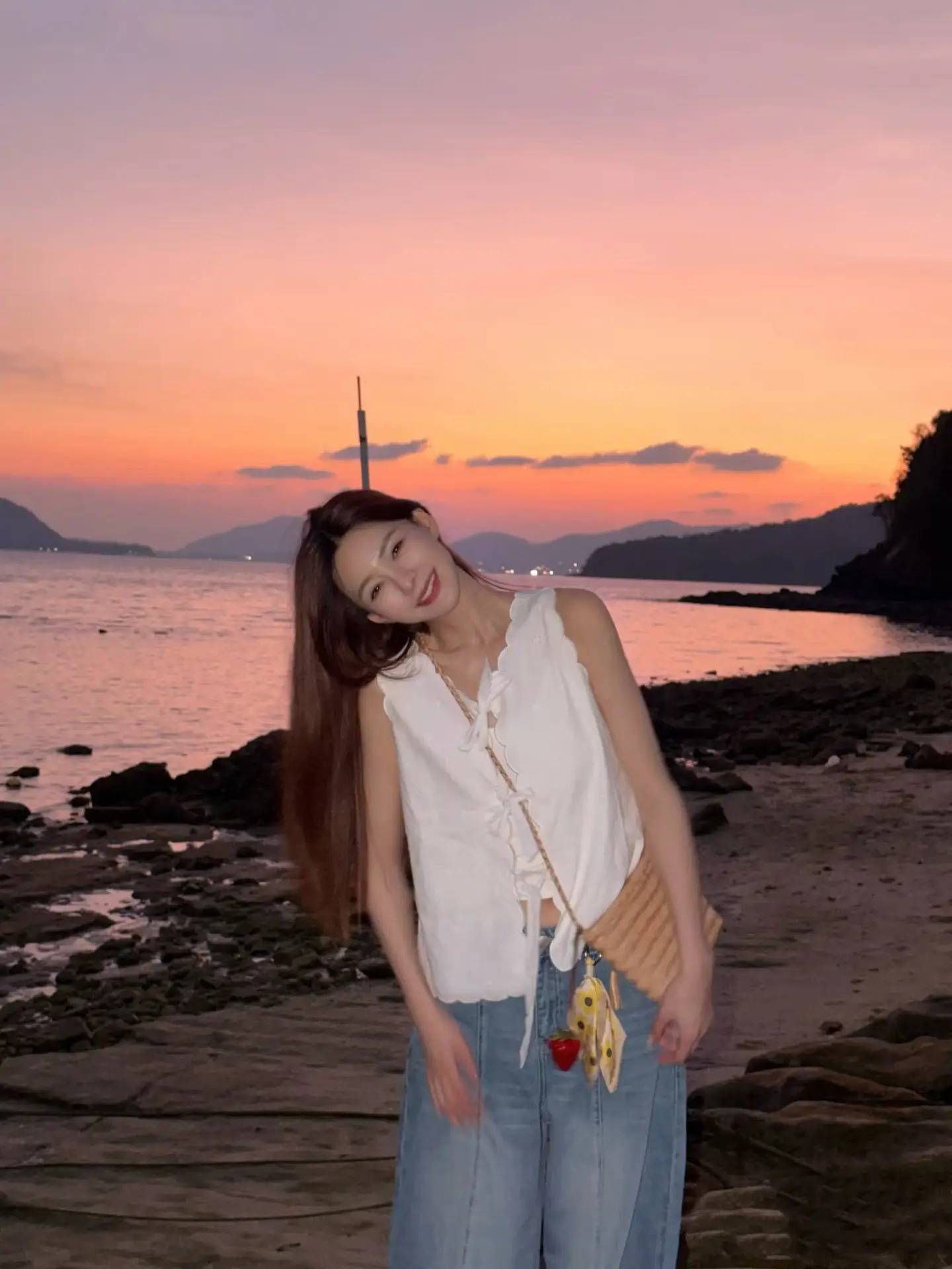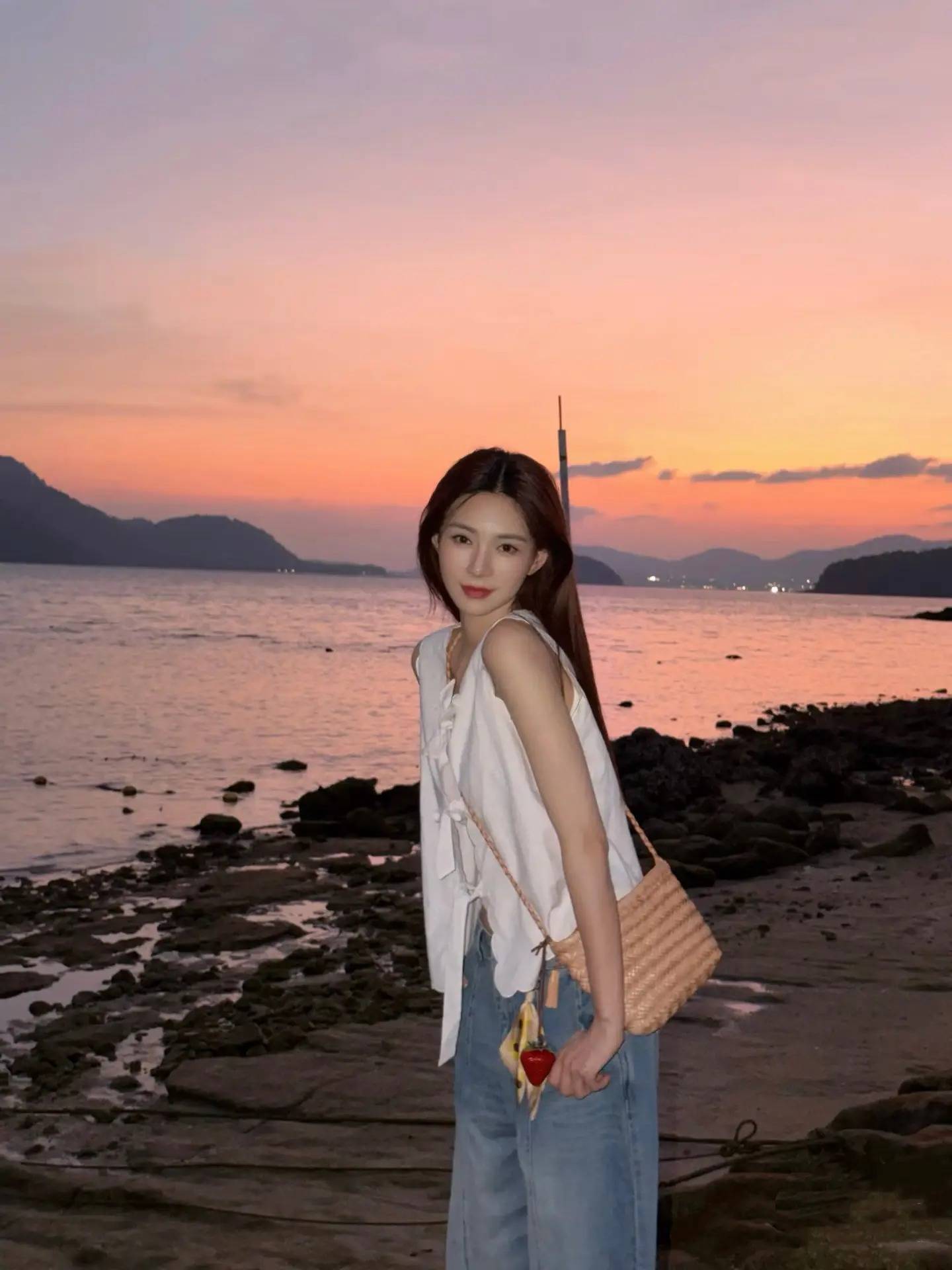 海边造型主打 “浅色系 + 轻盈材质”,白色、浅蓝、米色等浅色系与晚霞、海水呼应,无袖、娃娃衫、连衣裙等轻盈材质适配海风,避免厚重布料带来的闷热感,同时用草编包、编织包等配饰增添度假感,让温柔与松弛并存。