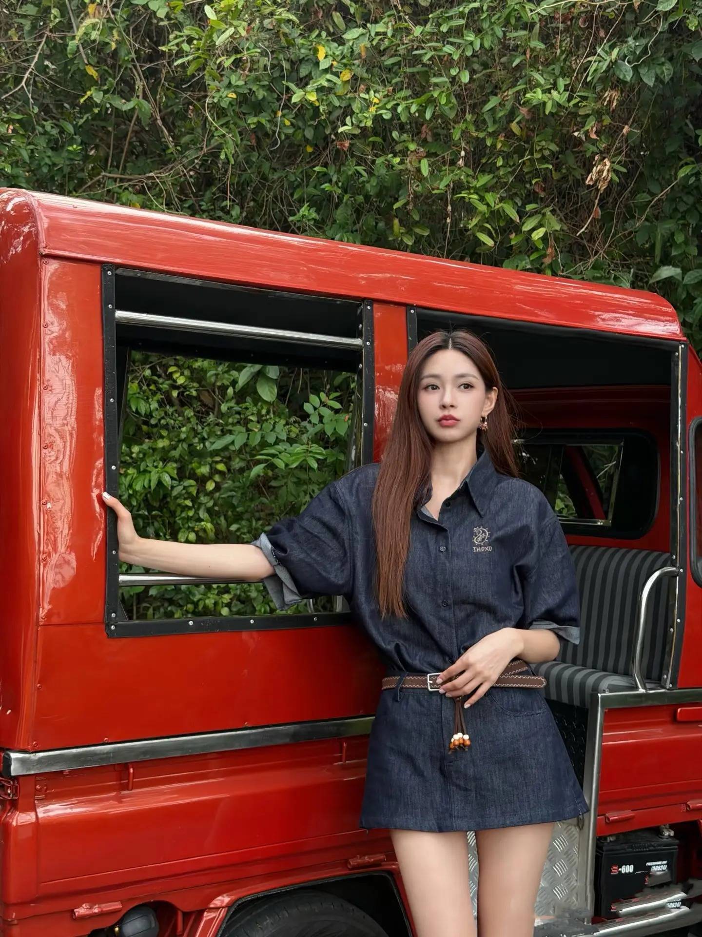 红色复古车打卡造型,深蓝色牛仔衬衫裙搭配同色系腰带,衬衫裙的宽松版型适配身材,腰带勾勒腰线,既保留松弛感又凸显比例,站在红色复古车旁,身后是满墙绿植,复古又随性,完美适配复古打卡点的氛围。