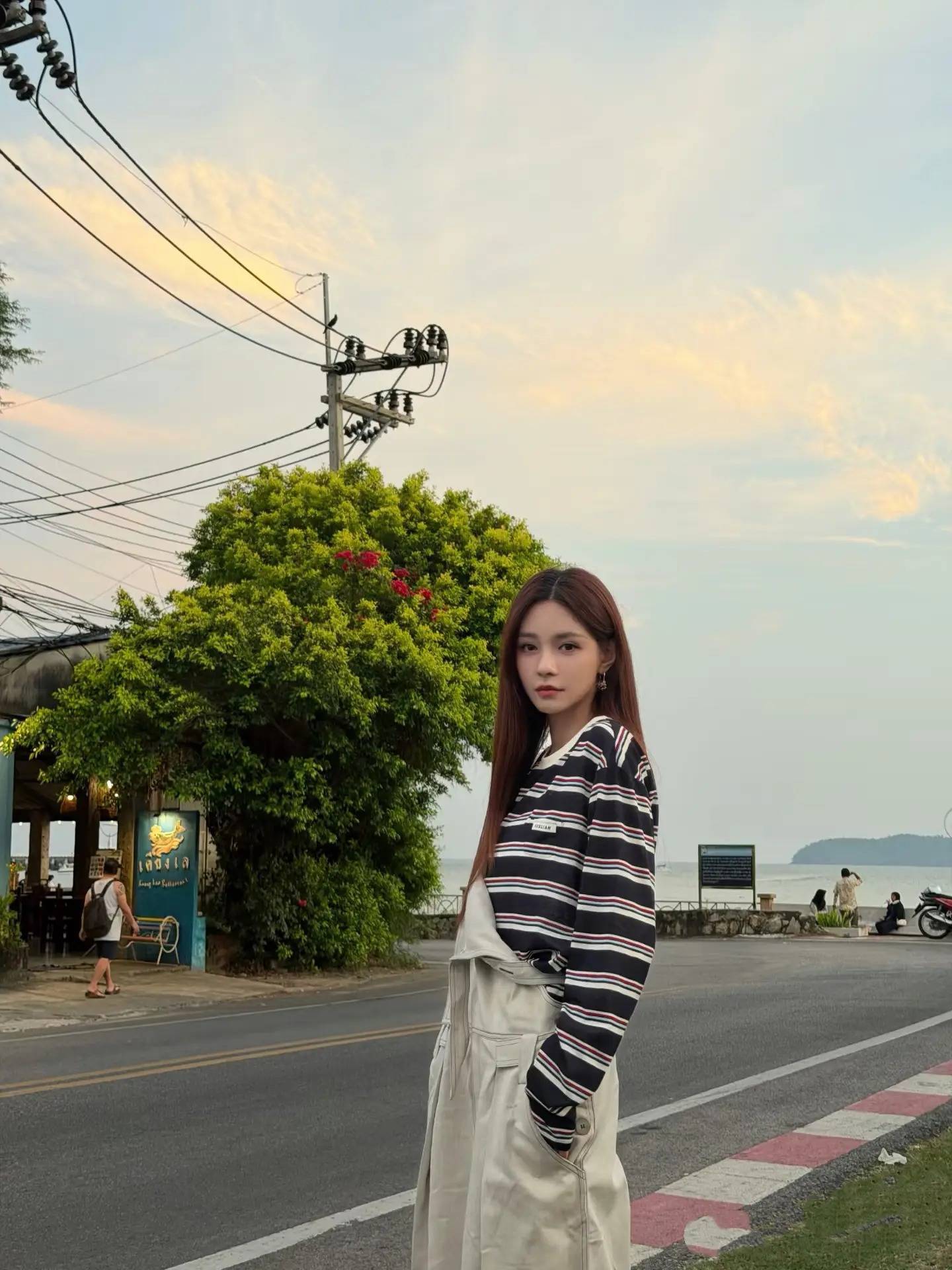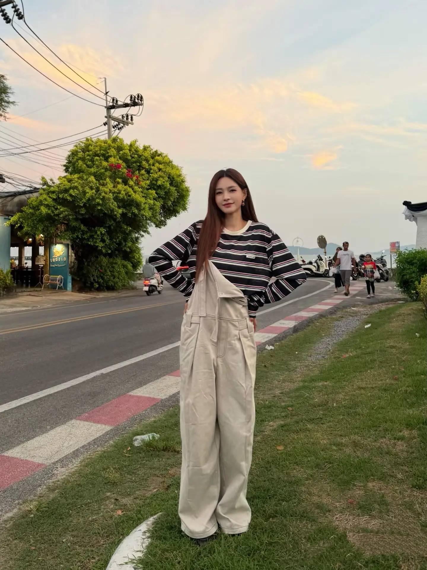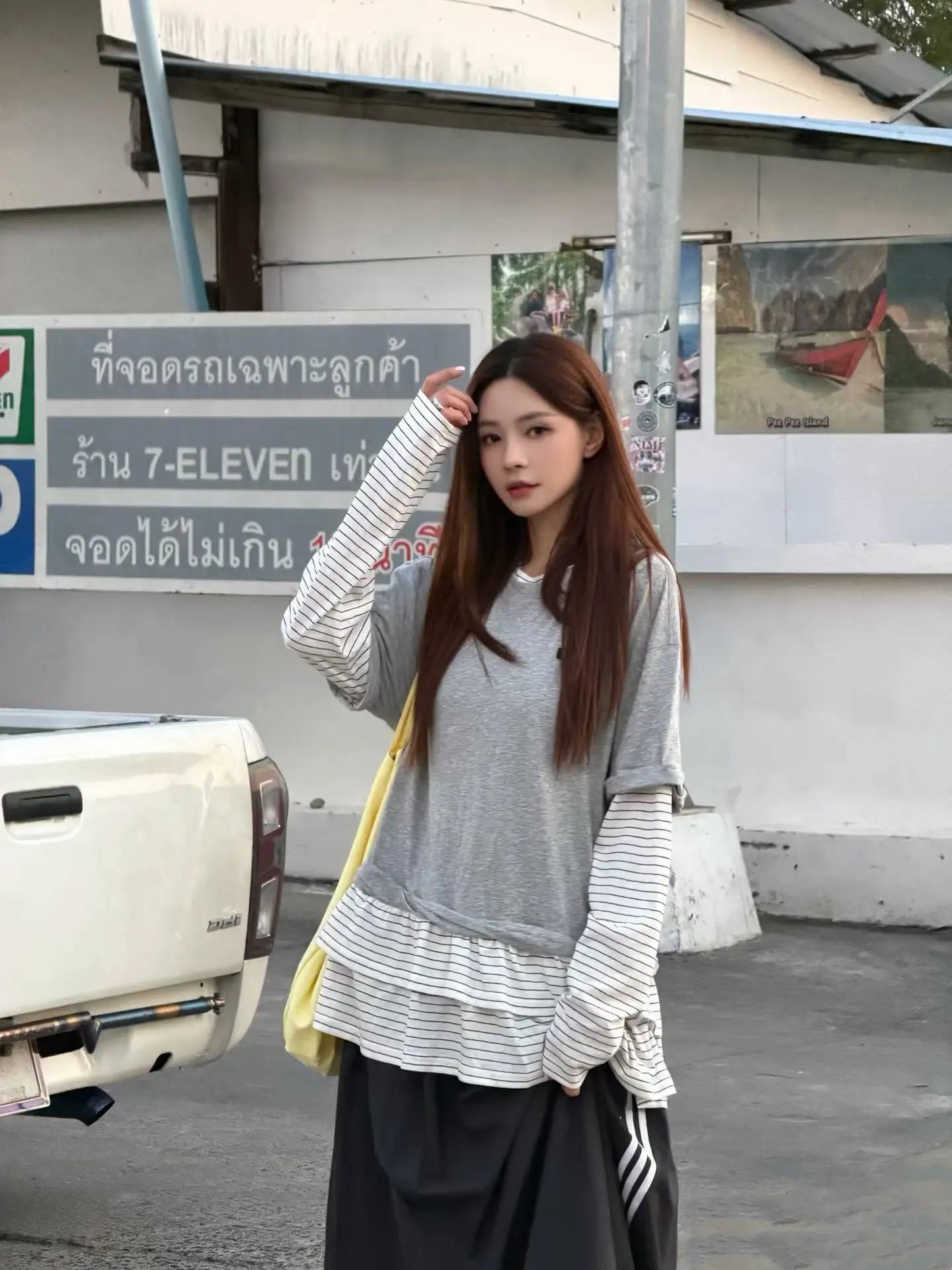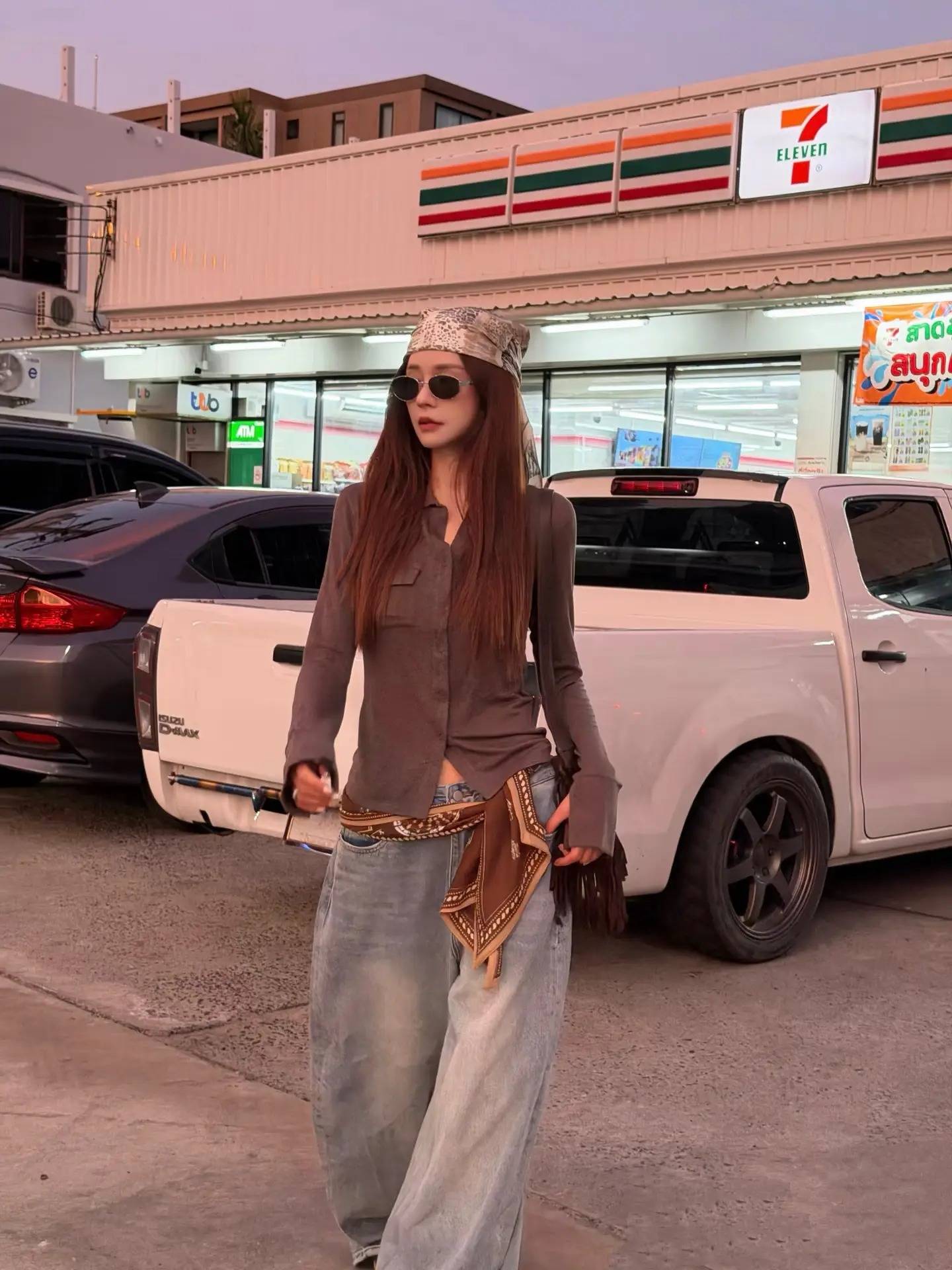 宽松的衬衫不刻意收腰,露出纤细腰肢,牛仔裤的破边设计增添随性,在落日的余晖里,背景是白色皮卡与热带街景,松弛感与氛围感拉满,完美适配街头打卡的随性氛围。