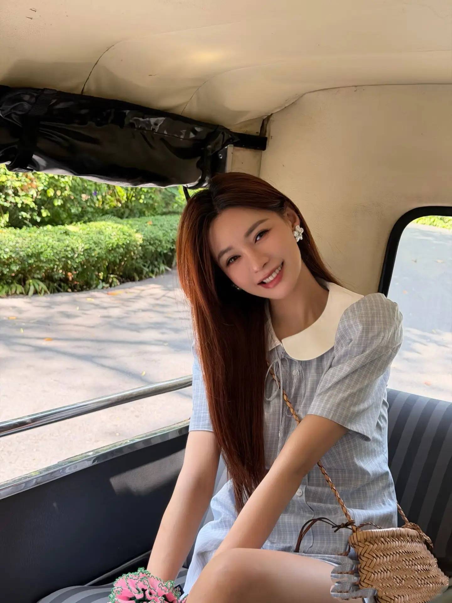 另一组海边漫步造型则走简约路线,浅蓝格纹娃娃领连衣裙搭配编织包,娃娃领的设计增添清甜感,裙摆随海风轻轻摆动,坐在复古红车的座椅上,背景是绿树与街道,笑容甜到人心坎里,完美适配海边的温柔氛围。