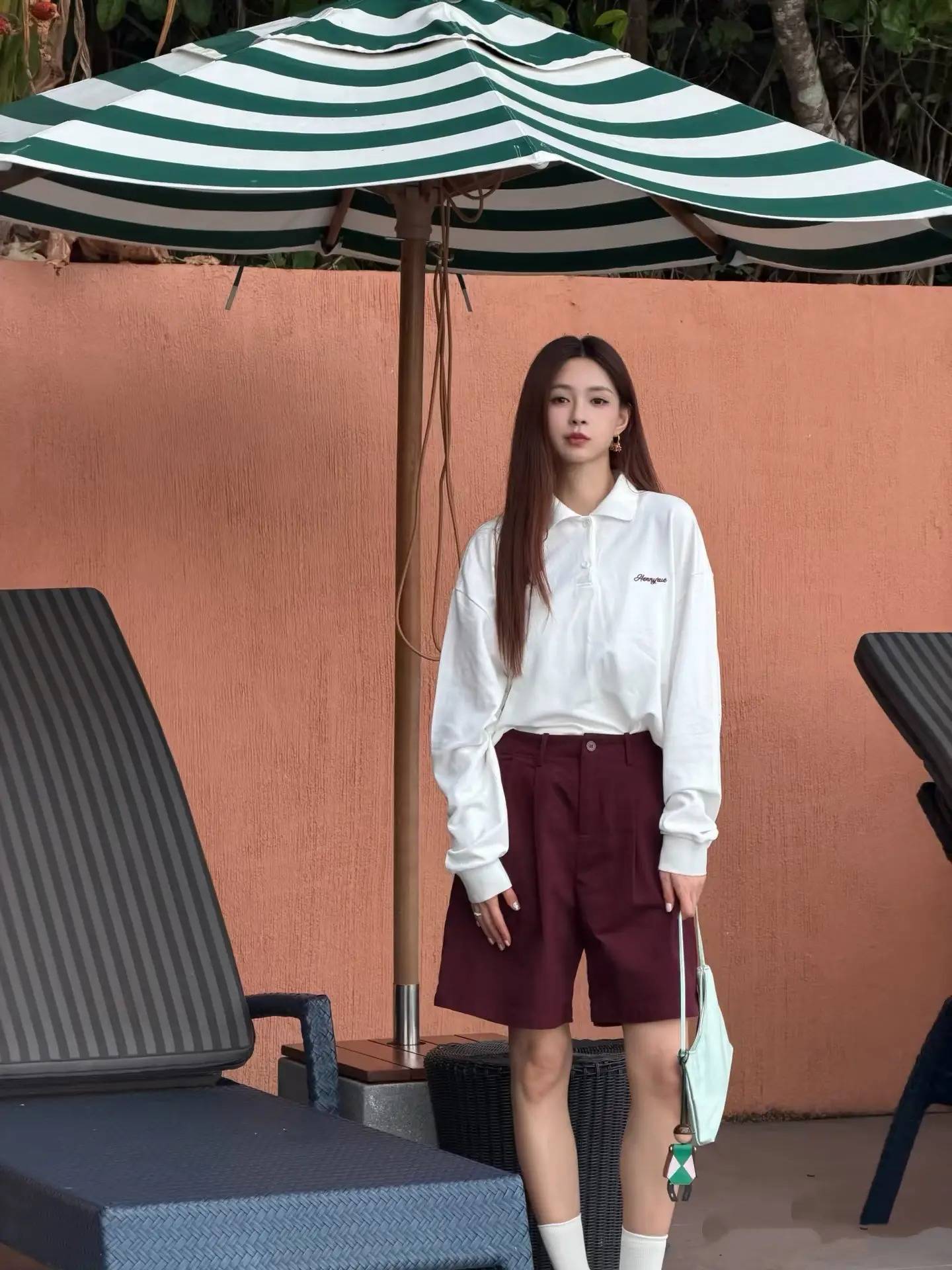 白色宽松 Polo 衫搭配酒红色五分裤,简约的 Polo 衫自带学院风,酒红色裤子提亮整体,脚踩白色中筒袜,手提薄荷绿小包,背景是绿白条纹遮阳伞与暖橙色墙面,松弛中透着精致,小众的薄荷绿小包成为视觉亮点,让穿搭既有度假的随性,又不失精致感。
